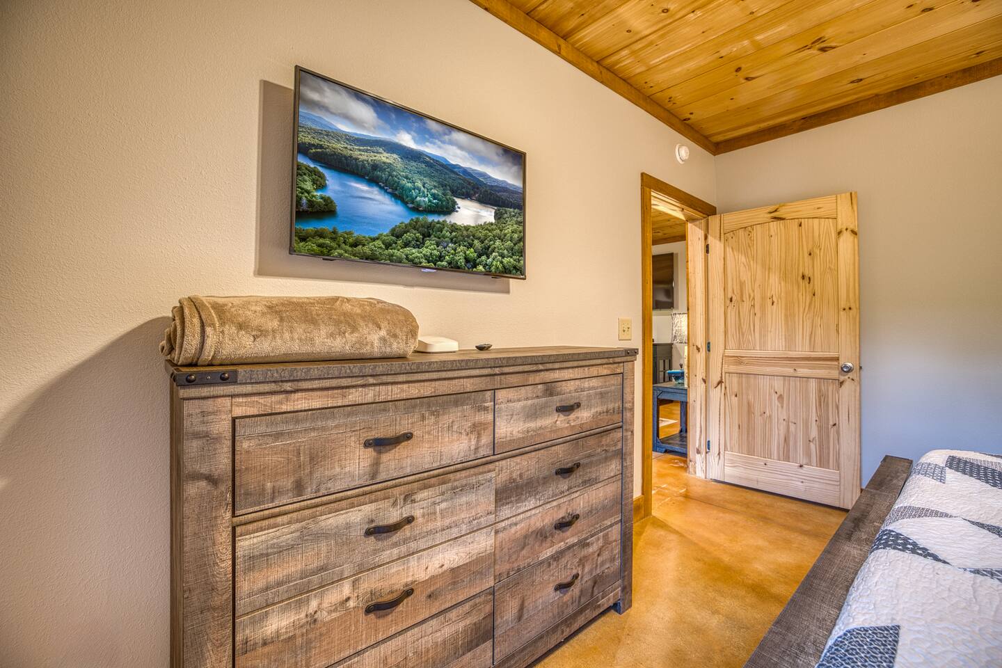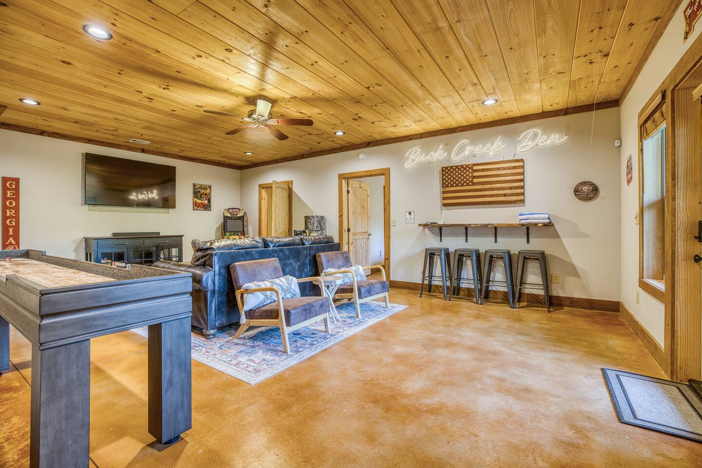 5 ⭐️ CREEKSIDE Mountain Getaway in Epworth, GA • Panoramic Mountain Views - NEW patio with putting green! ⛰️ • 20 mins to DT Blue Ridge (Breweries, Shopping, & The Scenic Railway) & DT McCaysville (Tubing & Hiking Galore!) 10 mins to horseback riding 🐴 🚂 • Shuffleboard • TVs in Each Bedroom 📺 • Outdoor Fireplace w/ Seating 🔥 • Hot Tub 💦 • King & Queen Plush Beds • Fully Stocked Kitchen • BBQ Grill • Indoor Fireplace 🔥 • Washer & Dryer • Board Games • Parking - 4 cars 🚗 Escape to the peaceful beauty of North Georgia at **Buck Creek Den**, a spacious and stylish cabin nestled along the serene banks of Buck Creek. This 4-bedroom, 3 bath retreat is **perfect for families, kids, groups of friends, and pets**—everyone is welcome here! Inside, the cabin boasts 2 ensuite bedrooms on the main floor (king and queen). On the terrace level an additional king bedroom and bunk room with queen over queen bunks. Bedrooms all come with own TV for private relaxation. Comfortably sleep up to 10 people. Stay connected with high-speed Wi-Fi, enjoy movie nights, or dive into some friendly competition with the video game setup on the lower level. Throughout the home, you'll find **brand-new high-end furniture** that blends rustic charm with modern comfort. The **FULLY stocked kitchen** is ready for family meals, and you’ll find both **indoor and outdoor dining table sets** for enjoying meals together, whether you’re cozying up inside or dining al fresco. Fire up the **propane gas grill** for a cookout and gather under the stars for unforgettable evenings. Outdoors, Buck Creek Den truly shines. Soak in the **private hot tub**, relax by the **outdoor firepit**, or let the kids and pets roam free across the **large open acreage**. Challenge the family to a game on the **brand-new mini golf putting green** and take in the **breathtaking mountain views**. At night, the **clear open skies** provide a perfect canvas for **stargazing**. With its Creekside setting, scenic views, and thoughtful amenities, **Buck Creek Den** is ideal for everything from weekend getaways to extended vacations. Whether you're unwinding by the water, exploring nearby trails, or simply enjoying the comforts of the cabin, this mountain retreat has it all. --- Let me know if you have any questions about the cabin or area. All guests must sign a rental agreement upon booking. This area has limited cell service, so guests are encouraged to use Wi-Fi feature on phone for calling.